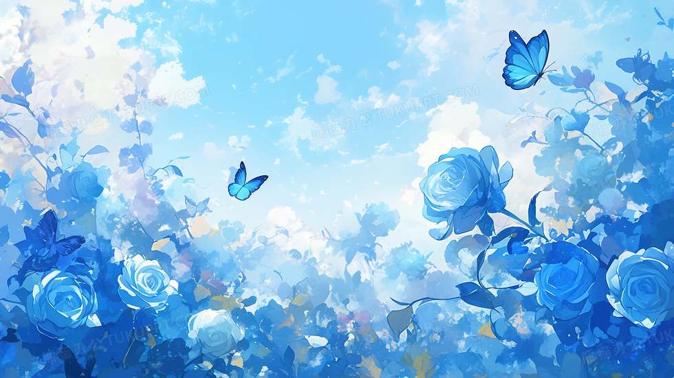 本作品内容为蓝色唯美水彩风玫瑰花蝴蝶插画, 格式为 jpg, 大小3 MB, 图片尺寸为2912 x 1632, 源文件无水印, 欢迎使用熊猫办公。 如认为平台内容涉嫌侵权,可通过邮件:tousu@tukuppt.com提出书面通知,我们将及时处理。