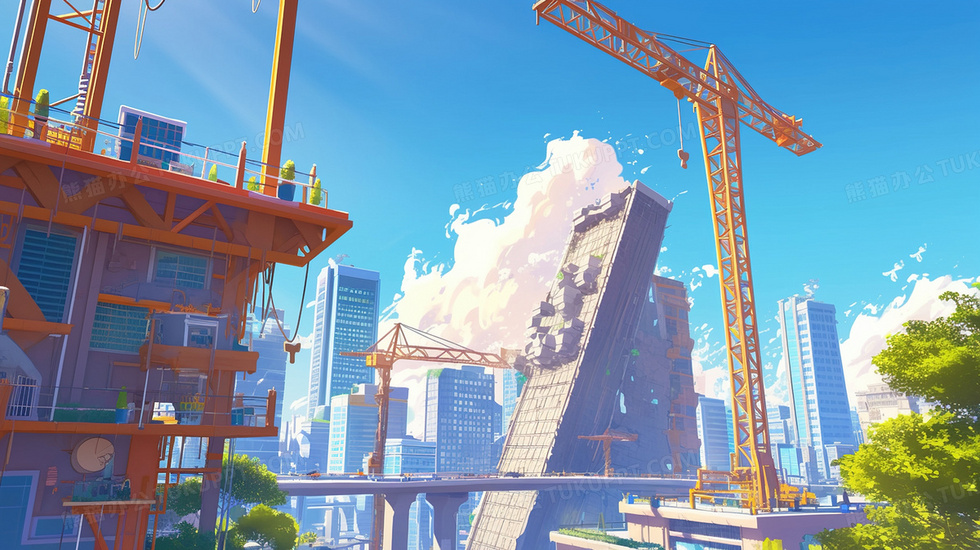 本作品内容为蓝天白云高楼大厦建筑工地施工场景插画, 格式为 jpg, 大小3 MB, 图片尺寸为2912 x 1632, 源文件无水印, 欢迎使用熊猫办公。 如认为平台内容涉嫌侵权,可通过邮件:tousu@tukuppt.com提出书面通知,我们将及时处理。