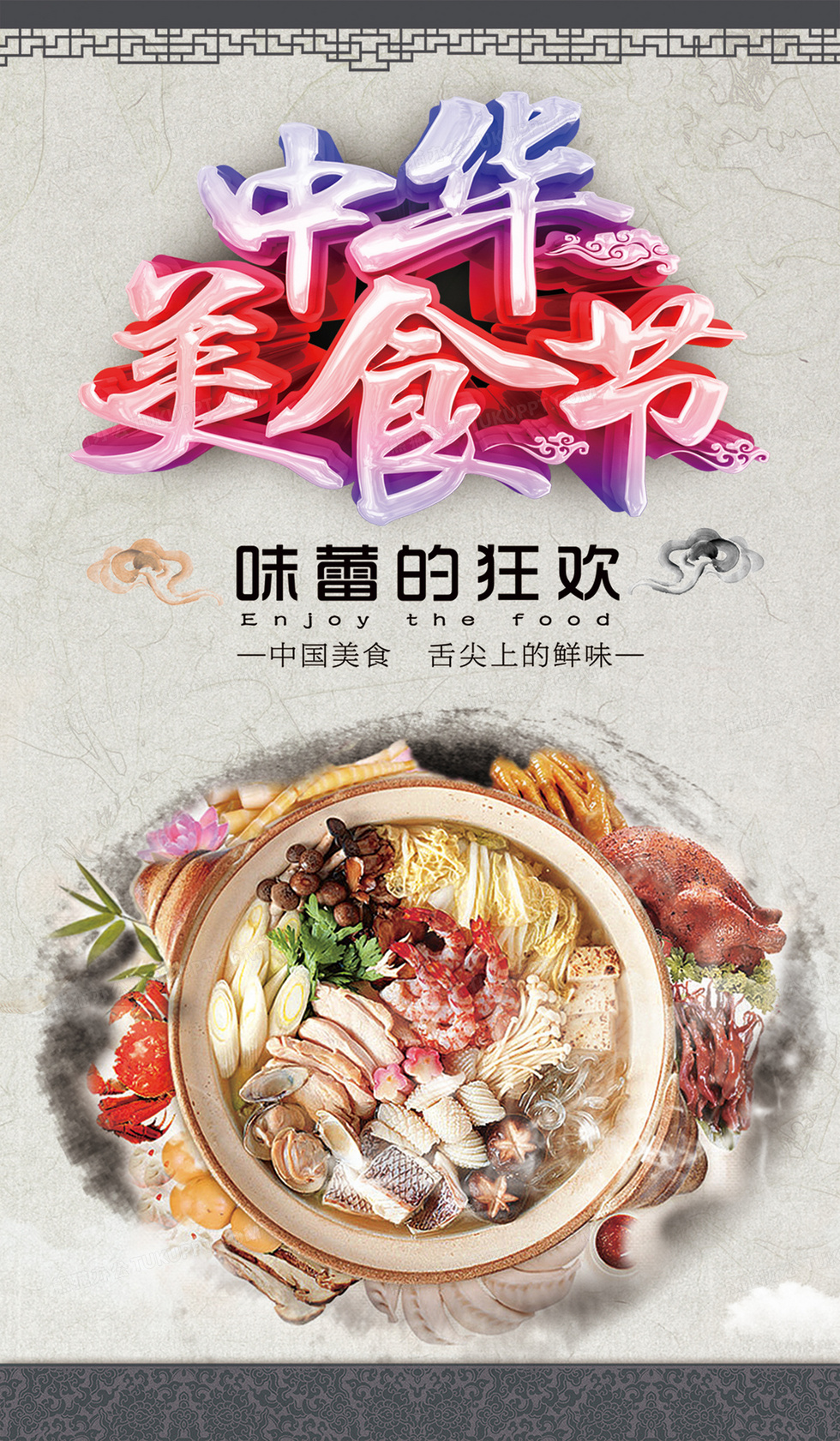 本作品内容为中华美食节狂欢海报, 格式为 psd, 图片尺寸为3524 x 6043, 作品中背景图片无需修改, 源文件无水印,可以直接使用, 欢迎使用熊猫办公。 如认为平台内容涉嫌侵权,可通过邮件:tousu@tukuppt.com提出书面通知,我们将及时处理。
