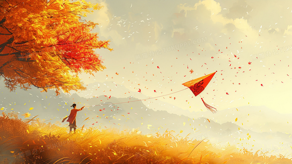 本作品内容为秋天户外放风筝的插画, 格式为 jpg, 大小6 MB, 图片尺寸为2912 x 1632, 源文件无水印, 欢迎使用熊猫办公。 如认为平台内容涉嫌侵权,可通过邮件:tousu@tukuppt.com提出书面通知,我们将及时处理。