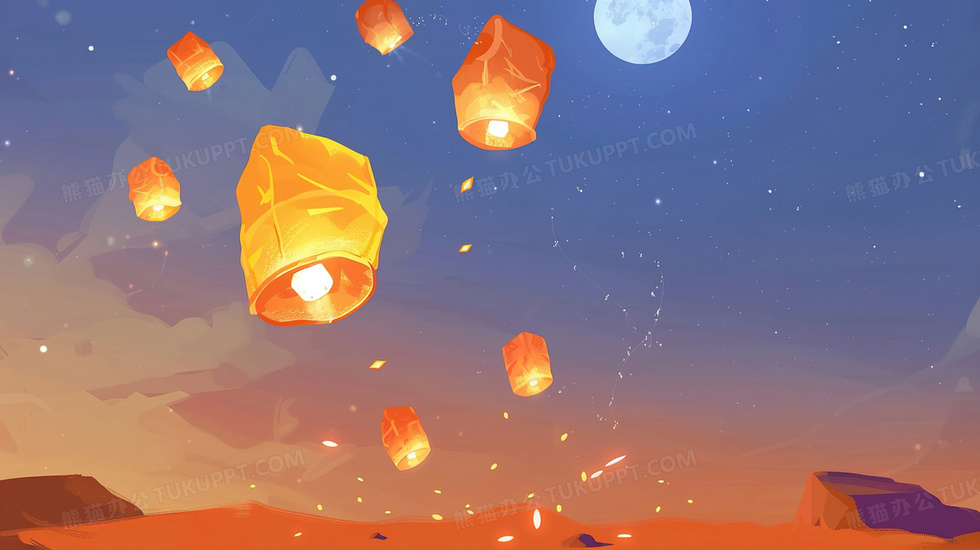 本作品内容为空中飘浮的祈福孔明灯插画, 格式为 jpg, 大小2 MB, 图片尺寸为2912 x 1632, 源文件无水印, 欢迎使用熊猫办公。 如认为平台内容涉嫌侵权,可通过邮件:tousu@tukuppt.com提出书面通知,我们将及时处理。