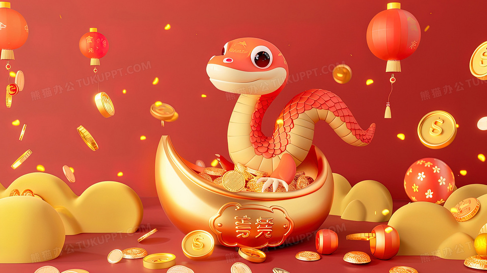 本作品内容为3D春节蛇年金元宝聚宝盆上的蛇插画, 格式为 jpg, 大小3 MB, 图片尺寸为2912 x 1632, 源文件无水印, 欢迎使用熊猫办公。 如认为平台内容涉嫌侵权,可通过邮件:tousu@tukuppt.com提出书面通知,我们将及时处理。
