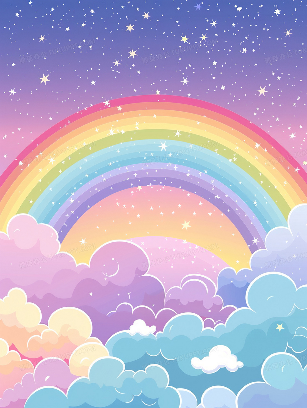 本作品内容为卡通彩虹梦幻背景, 格式为 jpg, 大小3 MB, 图片尺寸为1856 x 2464, 作品中背景图片无需修改, 源文件无水印,可以直接使用, 欢迎使用熊猫办公。 如认为平台内容涉嫌侵权,可通过邮件:tousu@tukuppt.com提出书面通知,我们将及时处理。