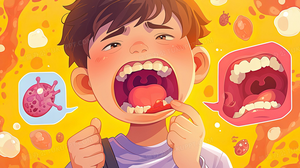 本作品内容为张开嘴巴检查口腔细菌的男孩插画, 格式为 jpg, 大小3 MB, 图片尺寸为2912 x 1632, 源文件无水印, 欢迎使用熊猫办公。 如认为平台内容涉嫌侵权,可通过邮件:tousu@tukuppt.com提出书面通知,我们将及时处理。
