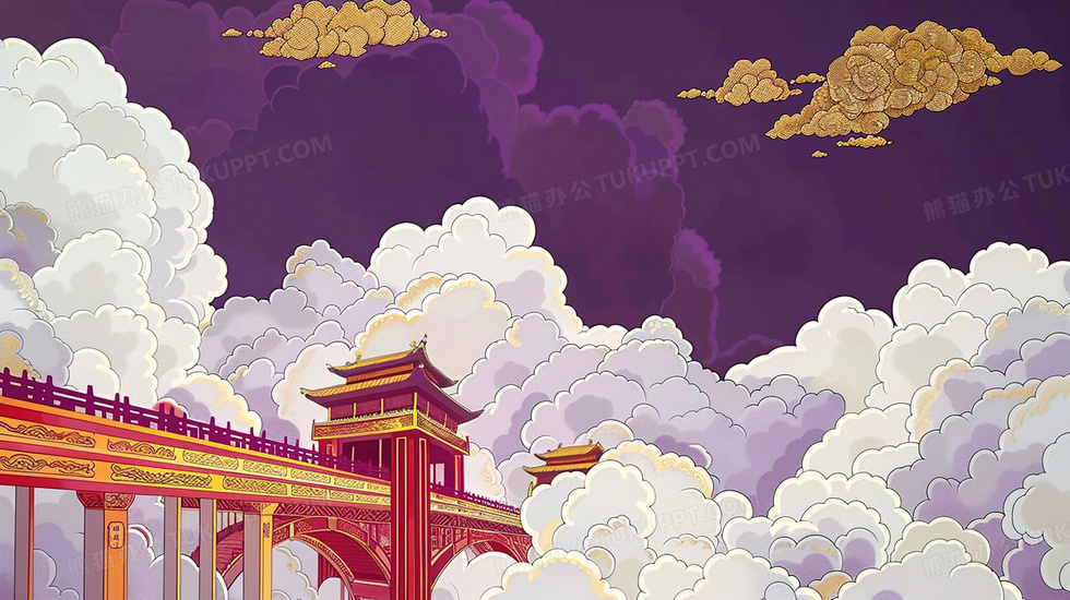 本作品内容为紫色描金中式建筑云朵插画, 格式为 jpg, 大小3 MB, 图片尺寸为2912 x 1632, 源文件无水印, 欢迎使用熊猫办公。 如认为平台内容涉嫌侵权,可通过邮件:tousu@tukuppt.com提出书面通知,我们将及时处理。