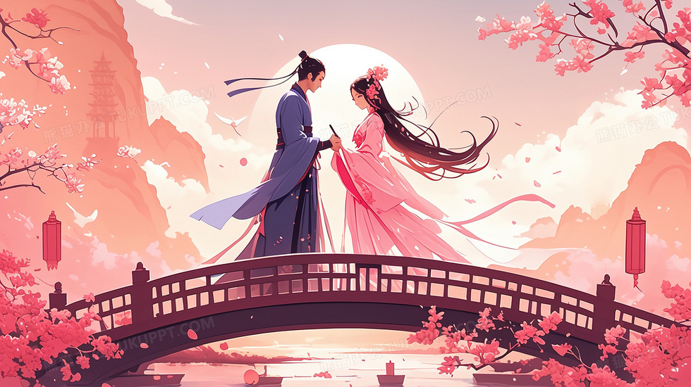 本作品内容为中国风七夕情侣桥上相会插画, 格式为 jpg, 大小3 MB, 图片尺寸为2912 x 1632, 源文件无水印, 欢迎使用熊猫办公。 如认为平台内容涉嫌侵权,可通过邮件:tousu@tukuppt.com提出书面通知,我们将及时处理。