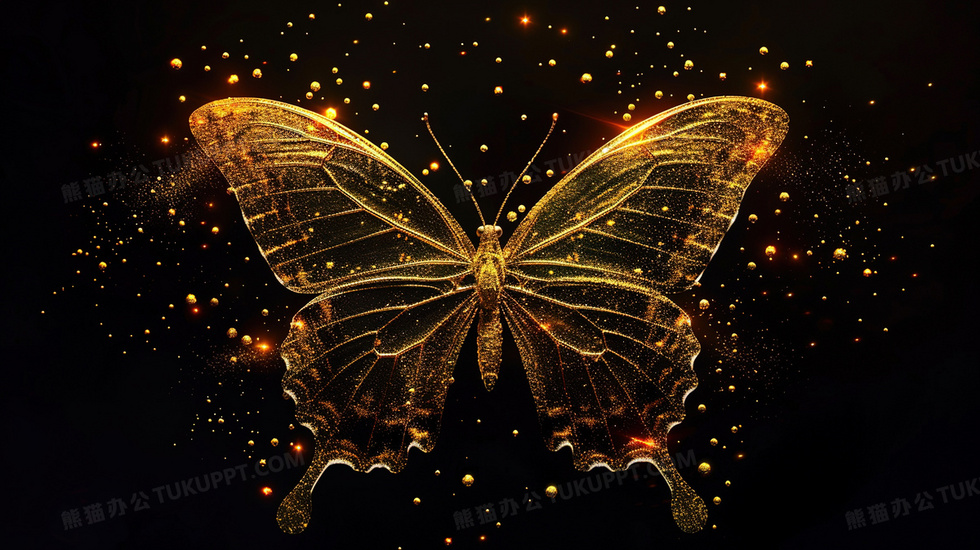 本作品内容为金粉颗粒组成的金色蝴蝶背景, 格式为 jpg, 大小3 MB, 图片尺寸为2912 x 1632, 作品中背景图片无需修改, 源文件无水印,可以直接使用, 欢迎使用熊猫办公。 如认为平台内容涉嫌侵权,可通过邮件:tousu@tukuppt.com提出书面通知,我们将及时处理。
