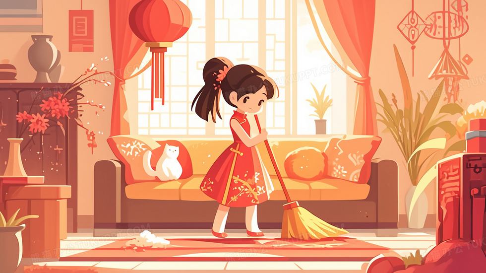 本作品内容为喜庆新年小女孩家庭大扫除插画, 格式为 jpg, 大小2 MB, 图片尺寸为2912 x 1632, 源文件无水印, 欢迎使用熊猫办公。 如认为平台内容涉嫌侵权,可通过邮件:tousu@tukuppt.com提出书面通知,我们将及时处理。