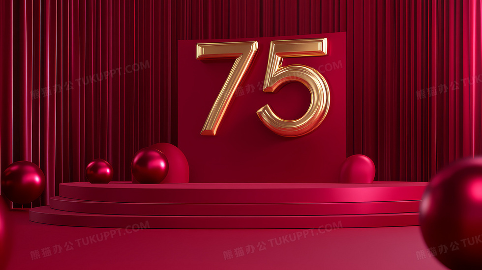本作品内容为国庆节75周年展台背景, 格式为 jpg, 大小6 MB, 图片尺寸为2912 x 1632, 作品中背景图片无需修改, 源文件无水印,可以直接使用, 欢迎使用熊猫办公。 如认为平台内容涉嫌侵权,可通过邮件:tousu@tukuppt.com提出书面通知,我们将及时处理。