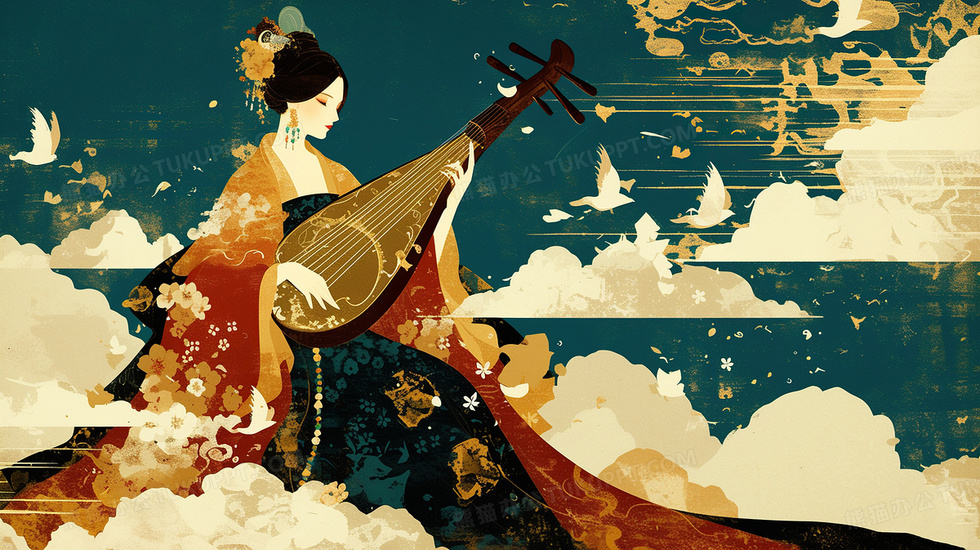 本作品内容为中国风女孩弹乐器琵琶插画, 格式为 jpg, 大小4 MB, 图片尺寸为2912 x 1632, 源文件无水印, 欢迎使用熊猫办公。 如认为平台内容涉嫌侵权,可通过邮件:tousu@tukuppt.com提出书面通知,我们将及时处理。