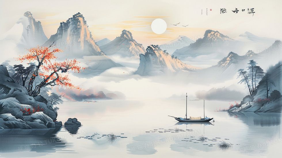 本作品内容为工笔画水墨孤舟静谧风景插画, 格式为 jpg, 大小3 MB, 图片尺寸为2912 x 1632, 源文件无水印, 欢迎使用熊猫办公。 如认为平台内容涉嫌侵权,可通过邮件:tousu@tukuppt.com提出书面通知,我们将及时处理。