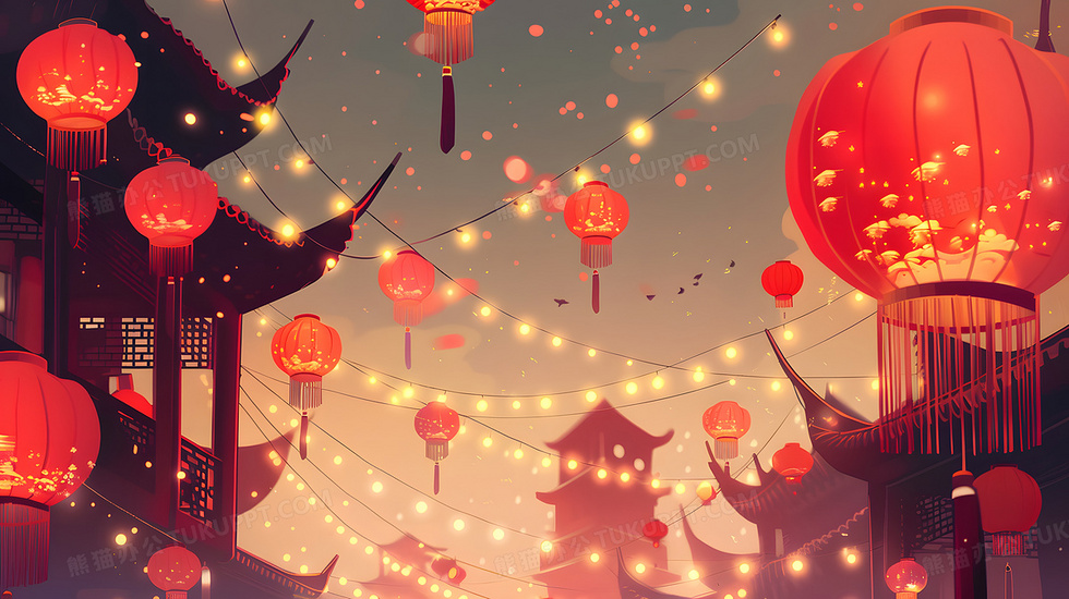 本作品内容为中国新年家家户户张灯结彩喜庆插画, 格式为 jpg, 大小8 MB, 图片尺寸为5824 x 3264, 源文件无水印, 欢迎使用熊猫办公。 如认为平台内容涉嫌侵权,可通过邮件:tousu@tukuppt.com提出书面通知,我们将及时处理。
