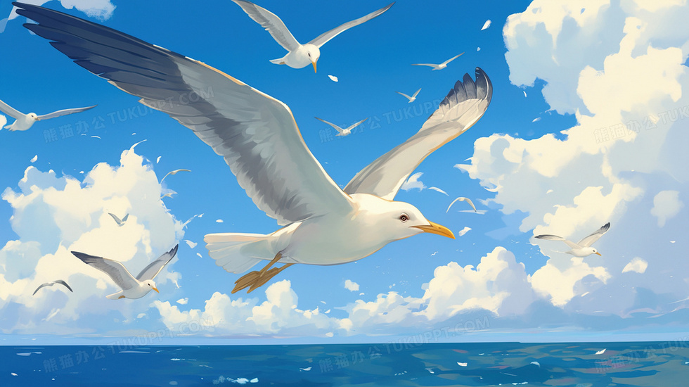 本作品内容为蓝天白云海边沙滩飞翔的海鸥插画, 格式为 jpg, 大小2 MB, 图片尺寸为2912 x 1632, 源文件无水印, 欢迎使用熊猫办公。 如认为平台内容涉嫌侵权,可通过邮件:tousu@tukuppt.com提出书面通知,我们将及时处理。