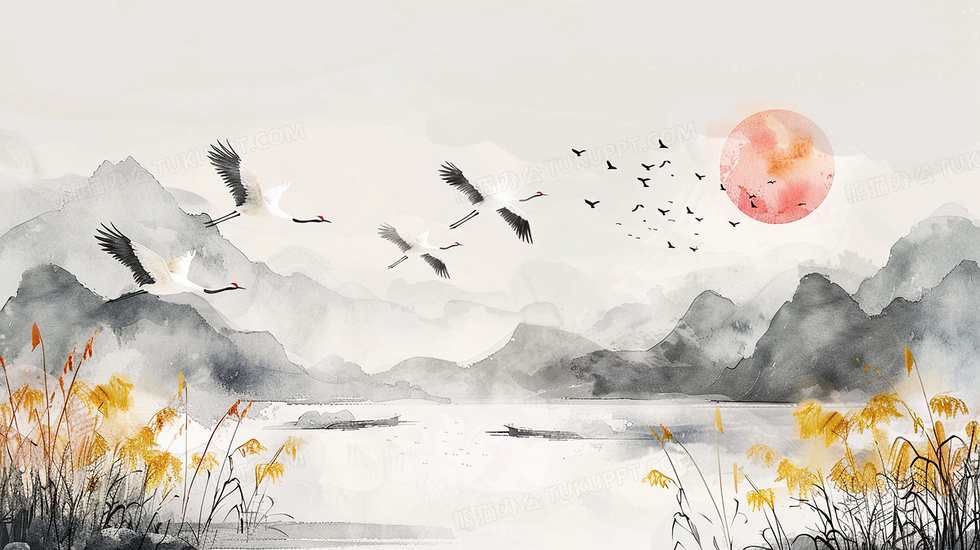 本作品内容为红日山水中国风水墨古风背景, 格式为 jpg, 大小3 MB, 图片尺寸为2912 x 1632, 作品中背景图片无需修改, 源文件无水印,可以直接使用, 欢迎使用熊猫办公。 如认为平台内容涉嫌侵权,可通过邮件:tousu@tukuppt.com提出书面通知,我们将及时处理。
