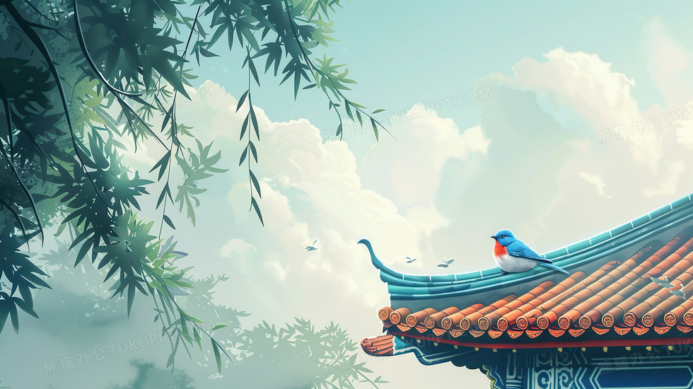 本作品内容为卡通中国风屋檐鸟建筑背景, 格式为 jpg, 大小4 MB, 图片尺寸为2912 x 1632, 作品中背景图片无需修改, 源文件无水印,可以直接使用, 欢迎使用熊猫办公。 如认为平台内容涉嫌侵权,可通过邮件:tousu@tukuppt.com提出书面通知,我们将及时处理。
