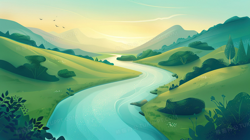 本作品内容为绿色生态河流风景插画, 格式为 jpg, 大小3 MB, 图片尺寸为2912 x 1632, 源文件无水印, 欢迎使用熊猫办公。 如认为平台内容涉嫌侵权,可通过邮件:tousu@tukuppt.com提出书面通知,我们将及时处理。