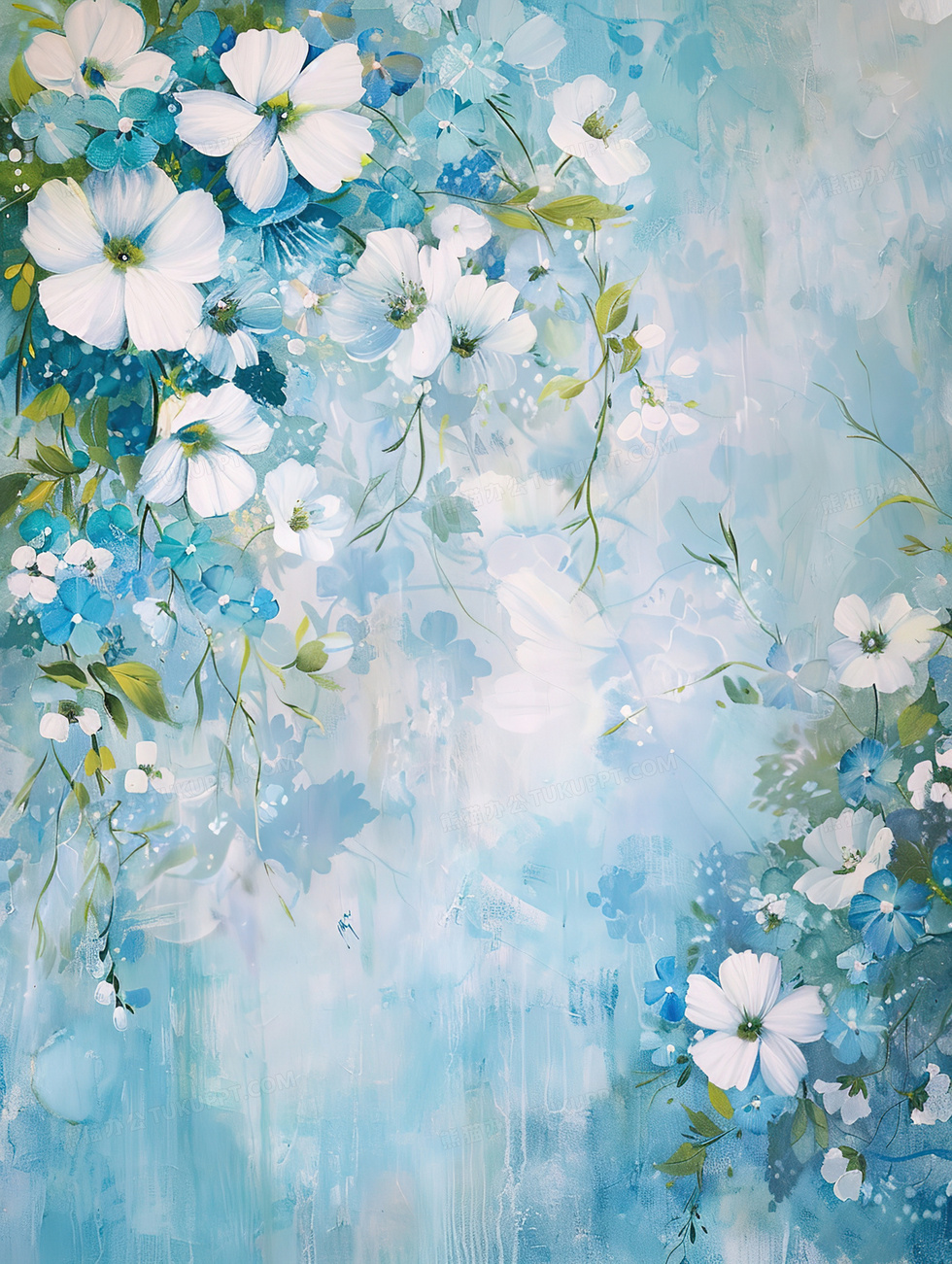 本作品内容为蓝色手绘油画质感植物花朵装饰边框背景, 格式为 jpg, 大小4 MB, 图片尺寸为1856 x 2464, 作品中背景图片无需修改, 源文件无水印,可以直接使用, 欢迎使用熊猫办公。 如认为平台内容涉嫌侵权,可通过邮件:tousu@tukuppt.com提出书面通知,我们将及时处理。