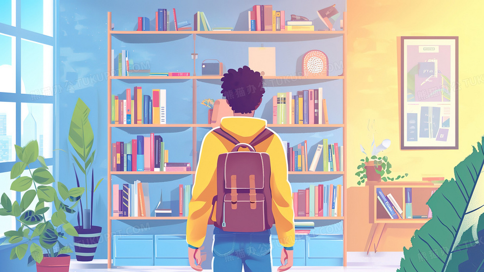 本作品内容为一个背着背包的学生站在书房里插画, 格式为 jpg, 大小2 MB, 图片尺寸为2912 x 1632, 源文件无水印, 欢迎使用熊猫办公。 如认为平台内容涉嫌侵权,可通过邮件:tousu@tukuppt.com提出书面通知,我们将及时处理。