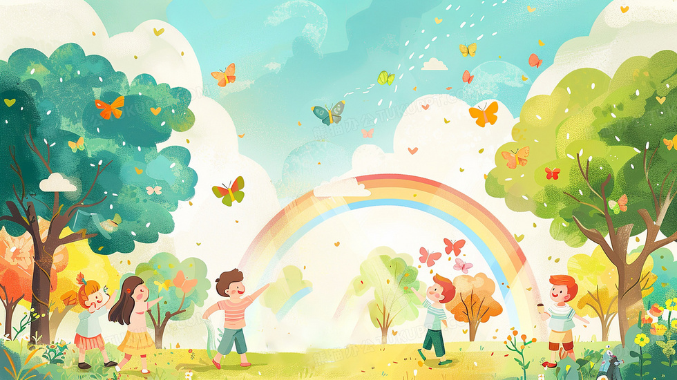 本作品内容为几个孩子儿童节在彩虹下花园里面草地上捉蝴蝶插画, 格式为 jpg, 大小4 MB, 图片尺寸为2912 x 1632, 源文件无水印, 欢迎使用熊猫办公。 如认为平台内容涉嫌侵权,可通过邮件:tousu@tukuppt.com提出书面通知,我们将及时处理。
