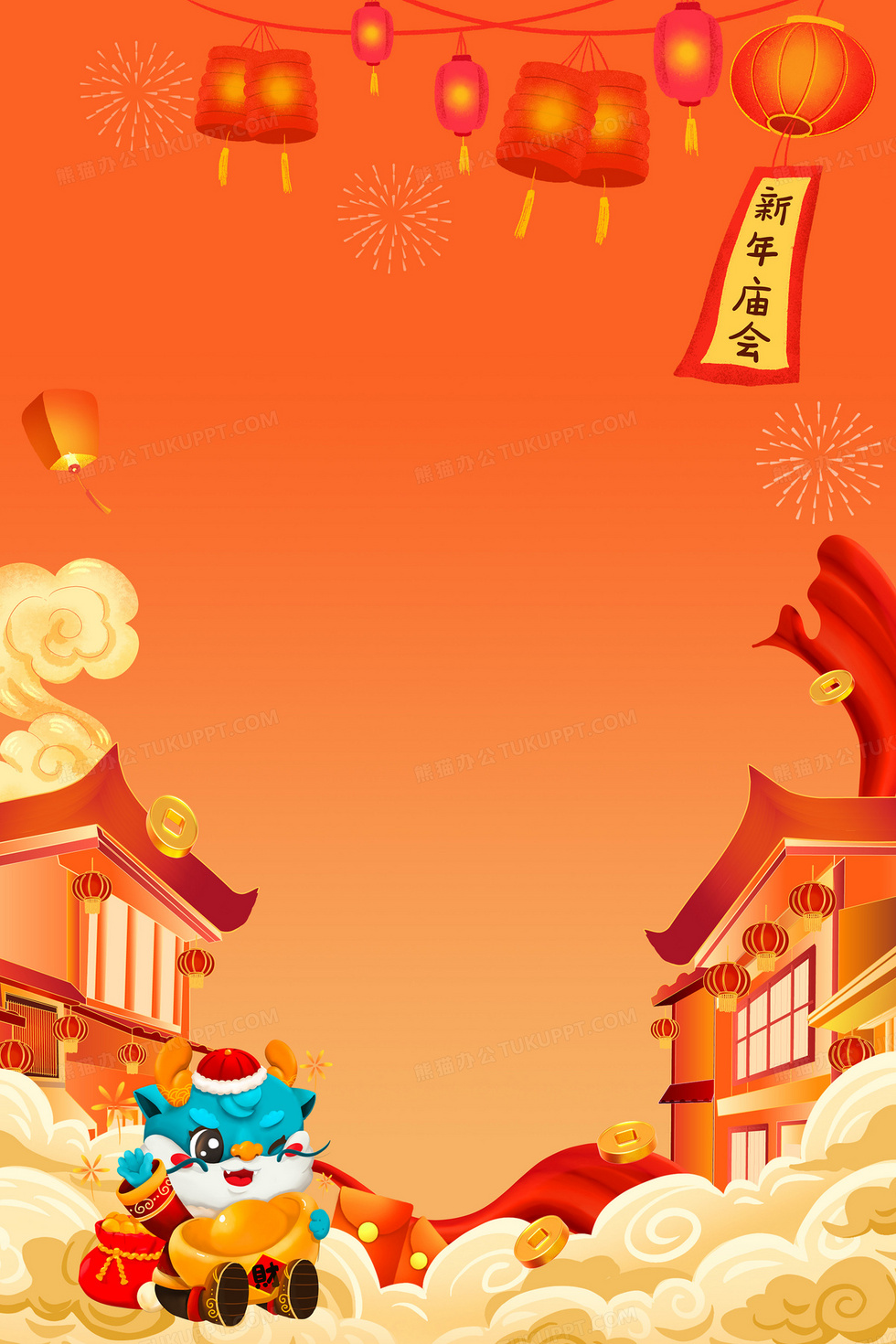 本作品内容为新春龙年春节街景背景, 格式为 psd, 大小34 MB, 图片尺寸为3543 x 5315, 作品中背景图片无需修改, 源文件无水印,可以直接使用, 欢迎使用熊猫办公。 如认为平台内容涉嫌侵权,可通过邮件:tousu@tukuppt.com提出书面通知,我们将及时处理。
