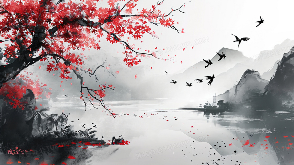 本作品内容为中国风红色花朵水墨插画, 格式为 jpg, 大小3 MB, 图片尺寸为2912 x 1632, 源文件无水印, 欢迎使用熊猫办公。 如认为平台内容涉嫌侵权,可通过邮件:tousu@tukuppt.com提出书面通知,我们将及时处理。