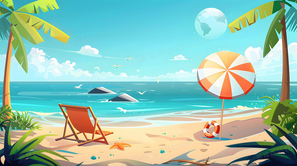 本作品内容为夏日夏天海边沙滩风景插画, 格式为 jpg, 大小8 MB, 图片尺寸为5824 x 3264, 源文件无水印, 欢迎使用熊猫办公。 如认为平台内容涉嫌侵权,可通过邮件:tousu@tukuppt.com提出书面通知,我们将及时处理。