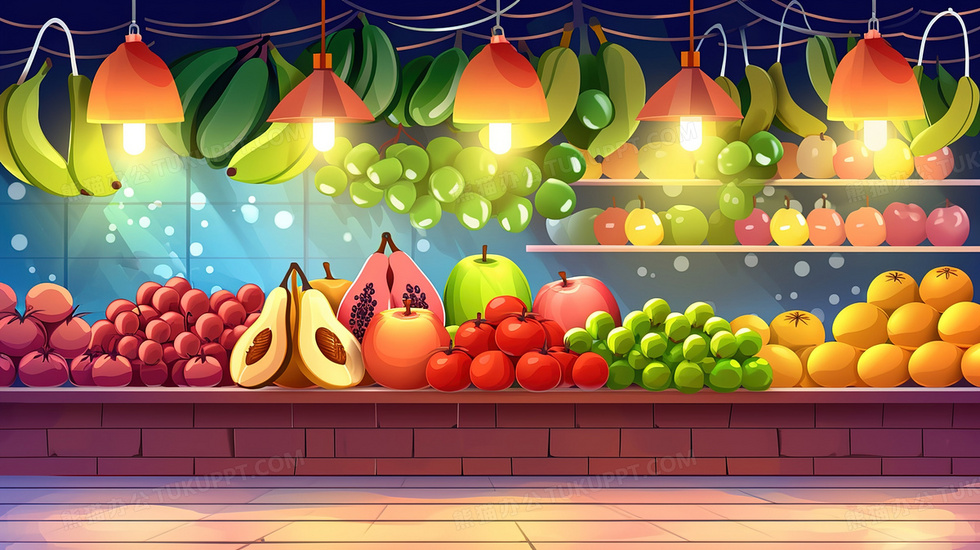 本作品内容为水果店里的琳琅满目的水果插画, 格式为 jpg, 大小3 MB, 图片尺寸为2912 x 1632, 源文件无水印, 欢迎使用熊猫办公。 如认为平台内容涉嫌侵权,可通过邮件:tousu@tukuppt.com提出书面通知,我们将及时处理。