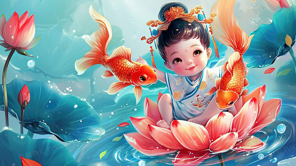 本作品内容为喜庆吉祥荷花锦鲤可爱的年画娃娃, 格式为 jpg, 大小4 MB, 图片尺寸为2912 x 1632, 源文件无水印, 欢迎使用熊猫办公。 如认为平台内容涉嫌侵权,可通过邮件:tousu@tukuppt.com提出书面通知,我们将及时处理。