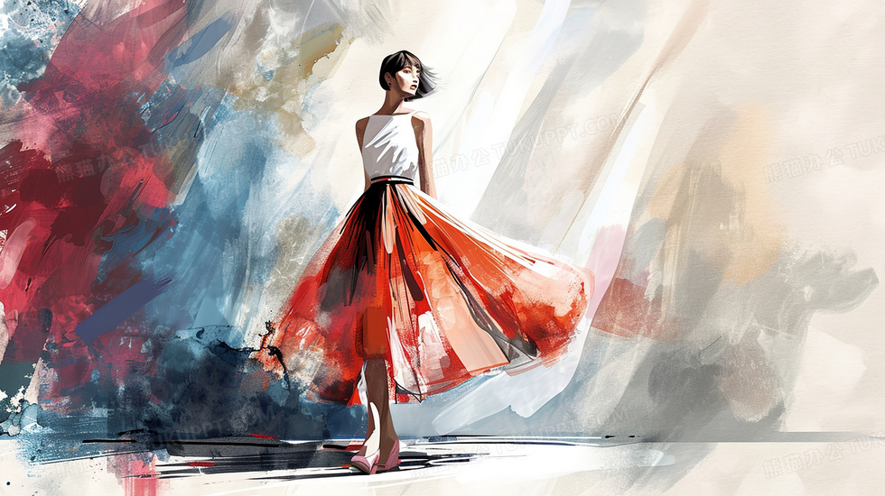 本作品内容为一个展示时尚裙子的女模特插画, 格式为 jpg, 大小3 MB, 图片尺寸为2912 x 1632, 源文件无水印, 欢迎使用熊猫办公。 如认为平台内容涉嫌侵权,可通过邮件:tousu@tukuppt.com提出书面通知,我们将及时处理。