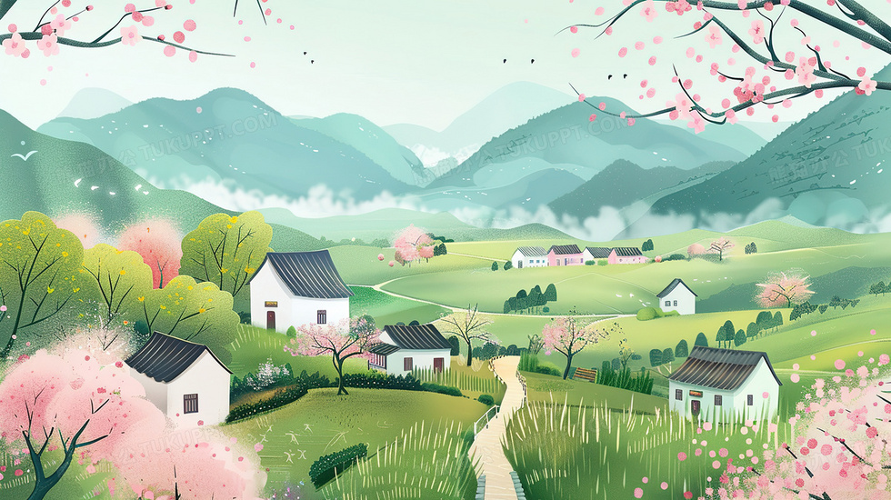 本作品内容为春天乡村田野自然风景插画, 格式为 jpg, 大小4 MB, 图片尺寸为2912 x 1632, 源文件无水印, 欢迎使用熊猫办公。 如认为平台内容涉嫌侵权,可通过邮件:tousu@tukuppt.com提出书面通知,我们将及时处理。