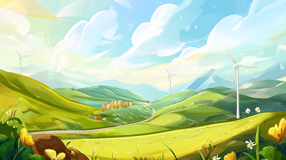 本作品内容为新能源户外风力发电站插画, 格式为 jpg, 大小3 MB, 图片尺寸为2912 x 1632, 源文件无水印, 欢迎使用熊猫办公。 如认为平台内容涉嫌侵权,可通过邮件:tousu@tukuppt.com提出书面通知,我们将及时处理。