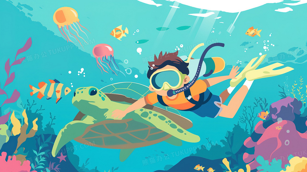 本作品内容为卡通男孩海洋潜水时和海龟嬉戏插画, 格式为 jpg, 大小3 MB, 图片尺寸为2912 x 1632, 源文件无水印, 欢迎使用熊猫办公。 如认为平台内容涉嫌侵权,可通过邮件:tousu@tukuppt.com提出书面通知,我们将及时处理。
