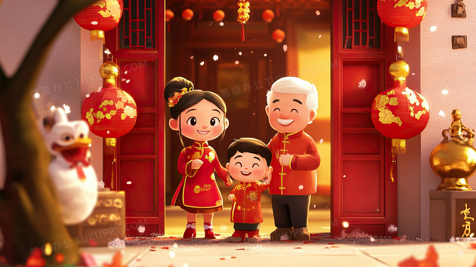 本作品内容为喜庆新年家人走亲戚拜年插画, 格式为 jpg, 大小3 MB, 图片尺寸为2912 x 1632, 源文件无水印, 欢迎使用熊猫办公。 如认为平台内容涉嫌侵权,可通过邮件:tousu@tukuppt.com提出书面通知,我们将及时处理。