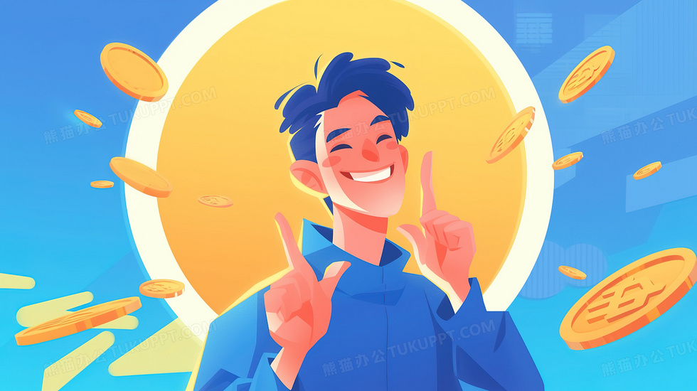 本作品内容为金融商务金币理财赚钱的男孩开心插画, 格式为 jpg, 大小2 MB, 图片尺寸为2912 x 1632, 源文件无水印, 欢迎使用熊猫办公。 如认为平台内容涉嫌侵权,可通过邮件:tousu@tukuppt.com提出书面通知,我们将及时处理。