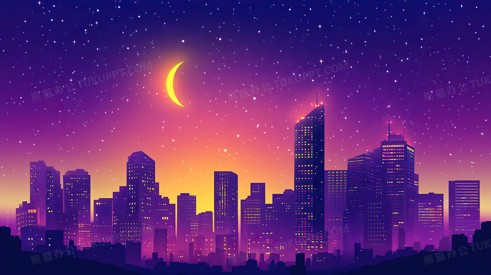 本作品内容为紫色夜晚城市星空夜景插画, 格式为 jpg, 大小4 MB, 图片尺寸为2912 x 1632, 源文件无水印, 欢迎使用熊猫办公。 如认为平台内容涉嫌侵权,可通过邮件:tousu@tukuppt.com提出书面通知,我们将及时处理。