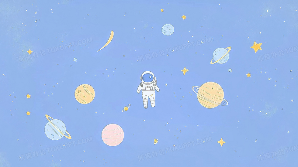 本作品内容为宇航员卡通边框可爱小清新背景, 格式为 jpg, 大小2 MB, 图片尺寸为2912 x 1632, 作品中背景图片无需修改, 源文件无水印,可以直接使用, 欢迎使用熊猫办公。 如认为平台内容涉嫌侵权,可通过邮件:tousu@tukuppt.com提出书面通知,我们将及时处理。
