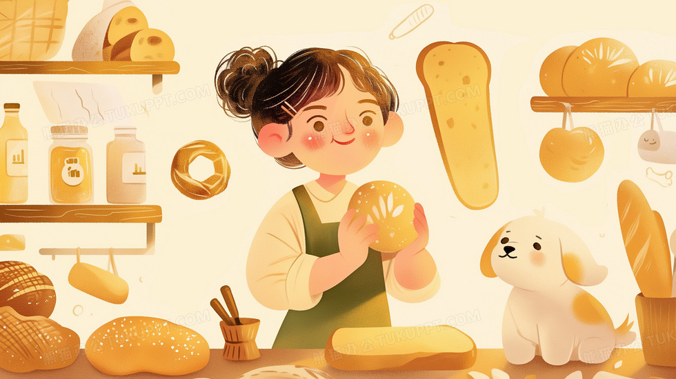 本作品内容为女孩在厨房做面包插画, 格式为 jpg, 大小6 MB, 图片尺寸为2912 x 1632, 源文件无水印, 欢迎使用熊猫办公。 如认为平台内容涉嫌侵权,可通过邮件:tousu@tukuppt.com提出书面通知,我们将及时处理。