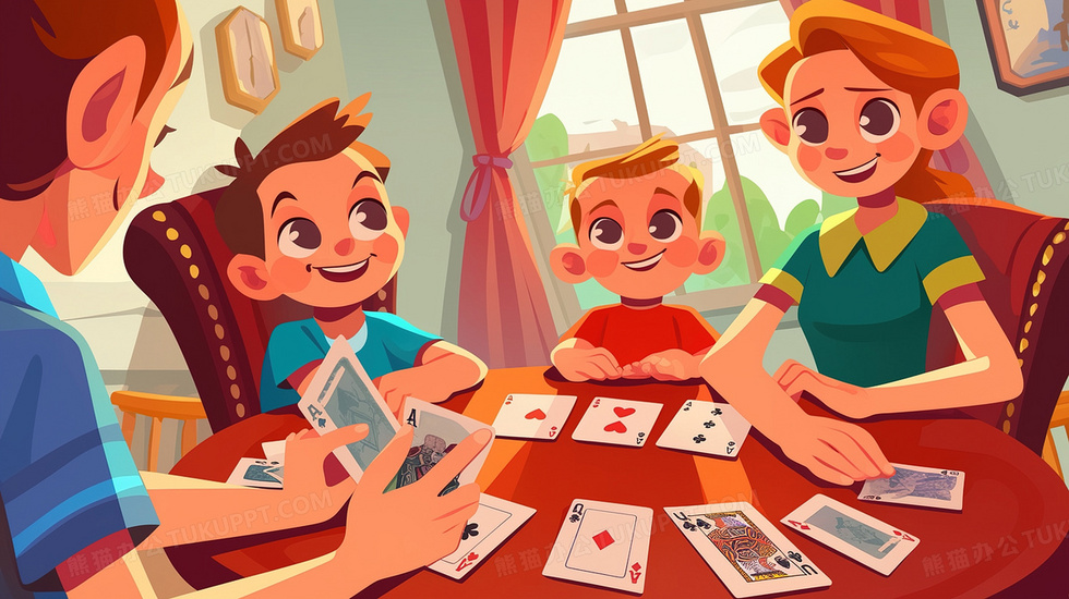 本作品内容为娱乐生活打扑克牌欢乐一家人卡通插画, 格式为 jpg, 大小2 MB, 图片尺寸为2912 x 1632, 源文件无水印, 欢迎使用熊猫办公。 如认为平台内容涉嫌侵权,可通过邮件:tousu@tukuppt.com提出书面通知,我们将及时处理。