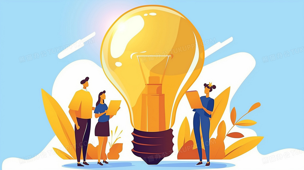 本作品内容为白领对着一个特别大的灯泡讨论问题插画, 格式为 jpg, 大小2 MB, 图片尺寸为2912 x 1632, 源文件无水印, 欢迎使用熊猫办公。 如认为平台内容涉嫌侵权,可通过邮件:tousu@tukuppt.com提出书面通知,我们将及时处理。