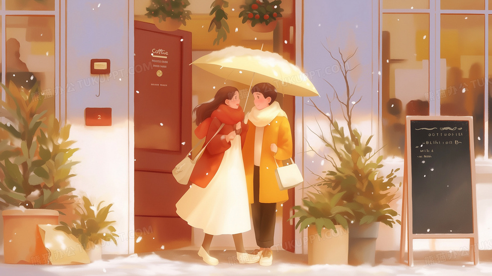 本作品内容为一对情侣从咖啡馆出来欣赏雪景插画, 格式为 jpg, 大小6 MB, 图片尺寸为2912 x 1632, 源文件无水印, 欢迎使用熊猫办公。 如认为平台内容涉嫌侵权,可通过邮件:tousu@tukuppt.com提出书面通知,我们将及时处理。