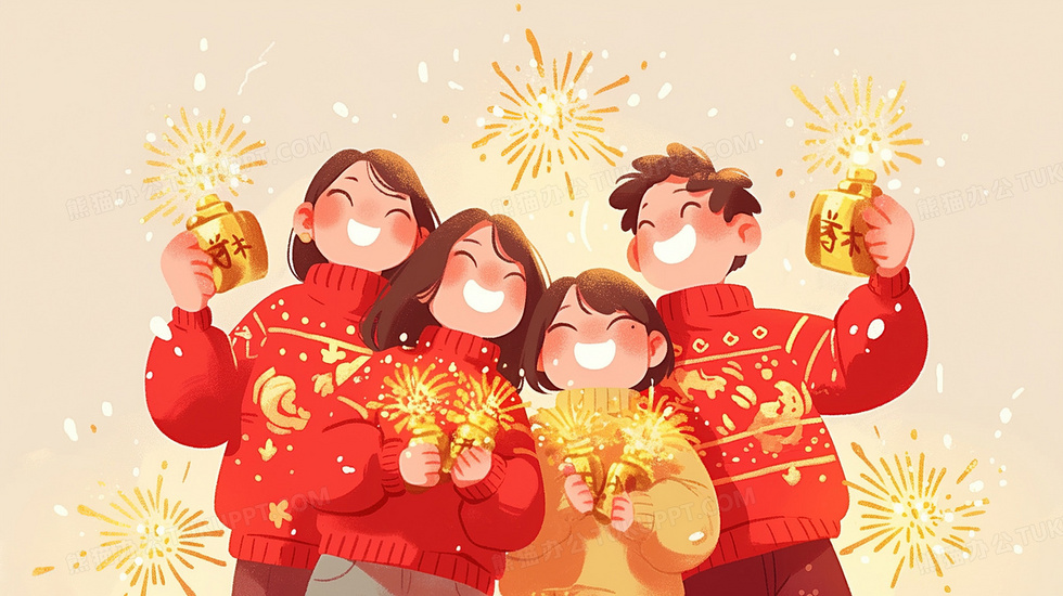 本作品内容为喜庆新年手拿烟花的开心一家四口插画, 格式为 jpg, 大小3 MB, 图片尺寸为2912 x 1632, 源文件无水印, 欢迎使用熊猫办公。 如认为平台内容涉嫌侵权,可通过邮件:tousu@tukuppt.com提出书面通知,我们将及时处理。