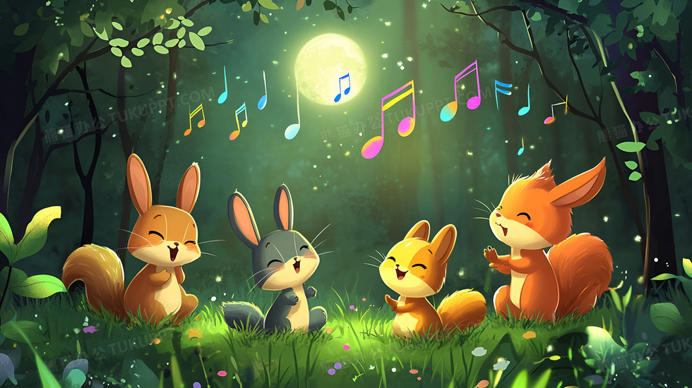 本作品内容为小动物们夜晚在森林里唱歌插画, 格式为 jpg, 大小1 MB, 图片尺寸为2912 x 1632, 源文件无水印, 欢迎使用熊猫办公。 如认为平台内容涉嫌侵权,可通过邮件:tousu@tukuppt.com提出书面通知,我们将及时处理。