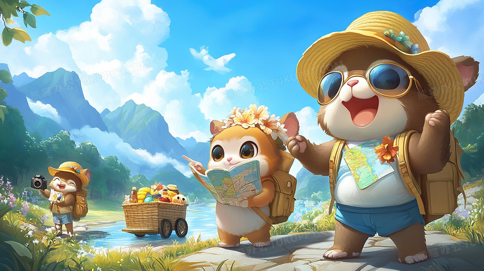 本作品内容为几个Q版小动物去旅行插画, 格式为 jpg, 大小4 MB, 图片尺寸为2912 x 1632, 源文件无水印, 欢迎使用熊猫办公。 如认为平台内容涉嫌侵权,可通过邮件:tousu@tukuppt.com提出书面通知,我们将及时处理。