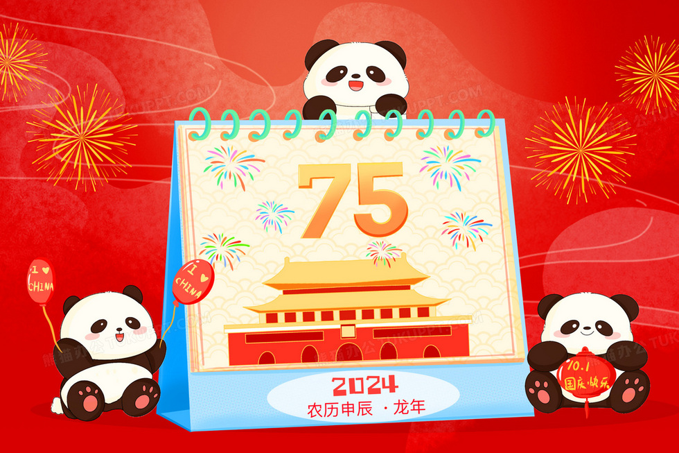 本作品内容为庆祝75周年国庆日历原创创意插画, 格式为 psd, 大小35 MB, 请使用软件PhotoShop(CC)打开, 源文件无水印, 欢迎使用熊猫办公。 如认为平台内容涉嫌侵权,可通过邮件:tousu@tukuppt.com提出书面通知,我们将及时处理。