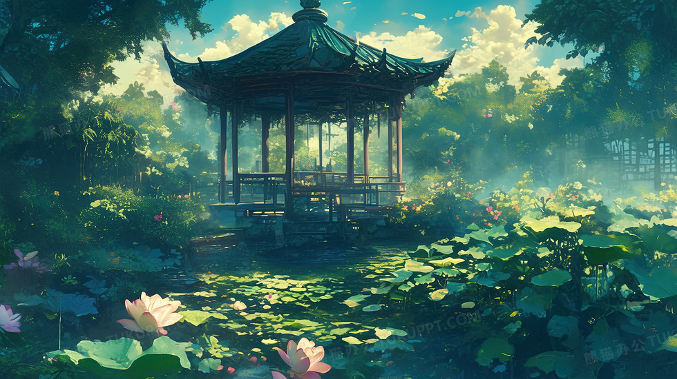 本作品内容为荷花池塘边的古亭中式建筑景观插画, 格式为 jpg, 大小4 MB, 图片尺寸为2912 x 1632, 源文件无水印, 欢迎使用熊猫办公。 如认为平台内容涉嫌侵权,可通过邮件:tousu@tukuppt.com提出书面通知,我们将及时处理。