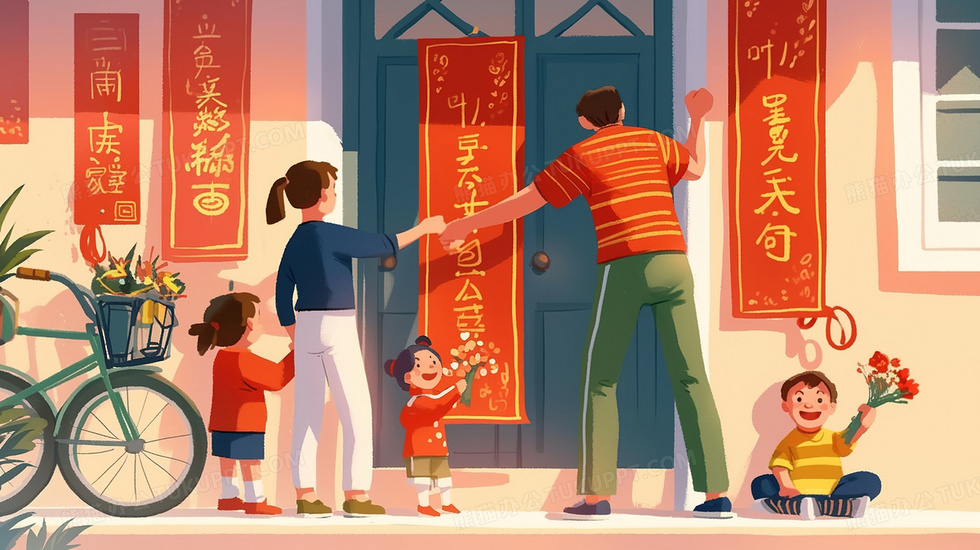 本作品内容为小年门口贴对联的温馨一家人插画, 格式为 jpg, 大小2 MB, 图片尺寸为2912 x 1632, 源文件无水印, 欢迎使用熊猫办公。 如认为平台内容涉嫌侵权,可通过邮件:tousu@tukuppt.com提出书面通知,我们将及时处理。