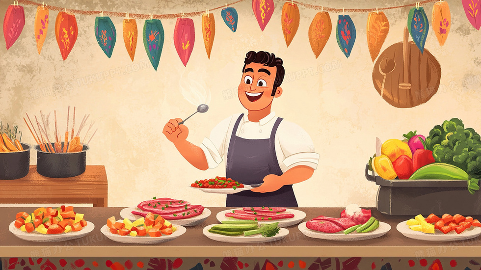 本作品内容为卡通厨师做出一桌丰盛美味佳肴插画, 格式为 jpg, 大小3 MB, 图片尺寸为2912 x 1632, 源文件无水印, 欢迎使用熊猫办公。 如认为平台内容涉嫌侵权,可通过邮件:tousu@tukuppt.com提出书面通知,我们将及时处理。