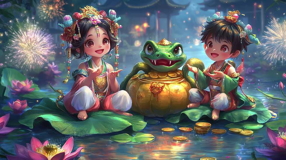 本作品内容为蛇年池塘荷叶聚宝盆男孩女孩与蛇插画, 格式为 jpg, 大小4 MB, 图片尺寸为2912 x 1632, 源文件无水印, 欢迎使用熊猫办公。 如认为平台内容涉嫌侵权,可通过邮件:tousu@tukuppt.com提出书面通知,我们将及时处理。