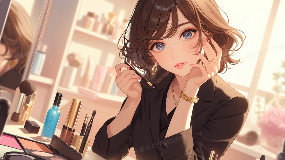 本作品内容为卡通女性化妆师正在桌前化妆插画, 格式为 jpg, 大小2 MB, 图片尺寸为2912 x 1632, 源文件无水印, 欢迎使用熊猫办公。 如认为平台内容涉嫌侵权,可通过邮件:tousu@tukuppt.com提出书面通知,我们将及时处理。