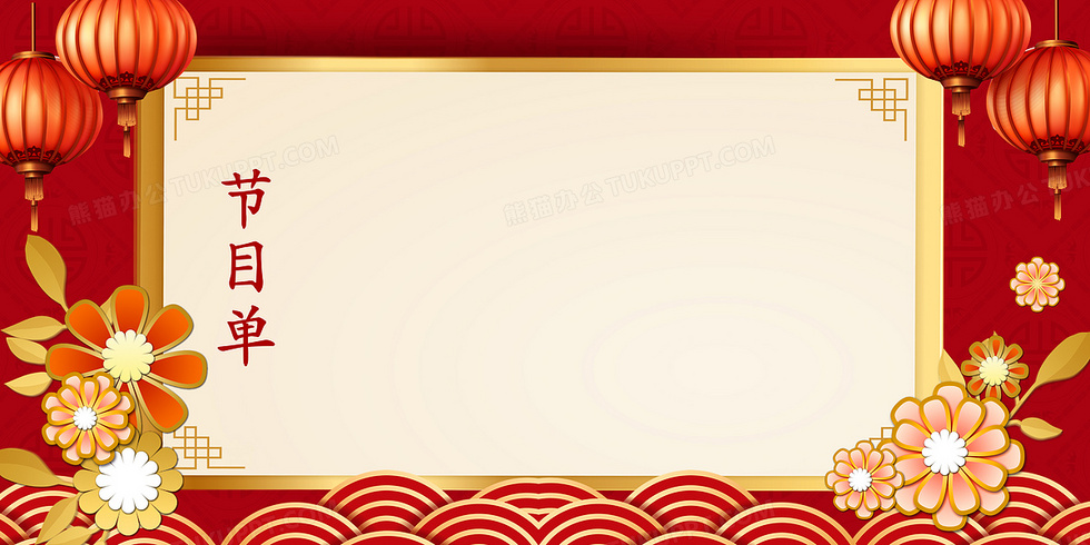本作品内容为红色大气新年年会节目单背景, 格式为 psd, 大小43 MB, 图片尺寸为7087 x 3543, 作品中背景图片无需修改, 源文件无水印,可以直接使用, 欢迎使用熊猫办公。 如认为平台内容涉嫌侵权,可通过邮件:tousu@tukuppt.com提出书面通知,我们将及时处理。